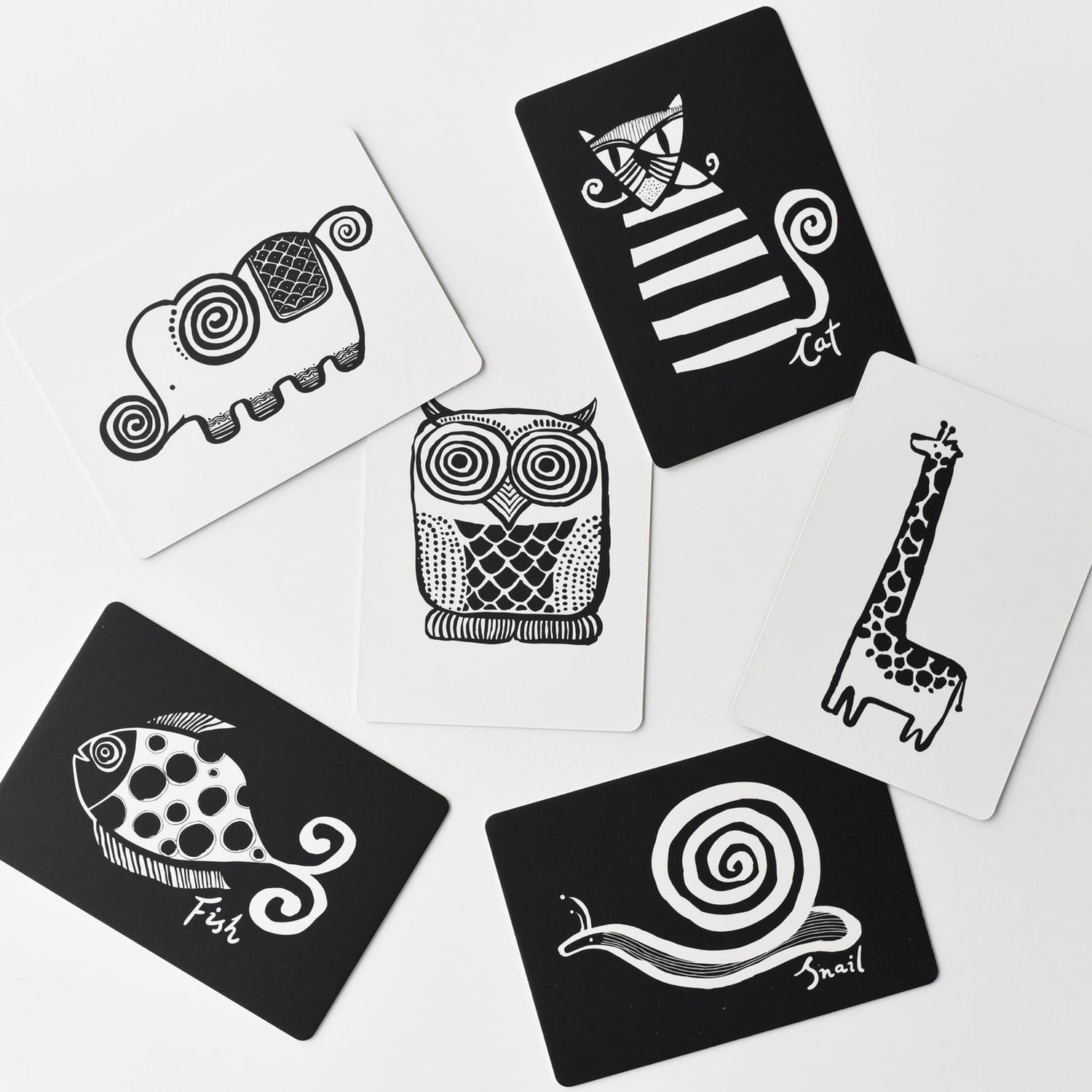 Inicialmente a los bebes les llama la atención los colores negro y blanco! Desde el inicio de su desarrollo, ellos comienzan a desarrollar sus habilidades visuales. Este adorable set de tarjetas incluye un elefante, un pez, una jirafa, un caracol, un búho y un gato! . Cada tarjeta 5"x7" esta impresa en material resistente a la exploración de un bebe, con acabado matte y orillas redondeadas.