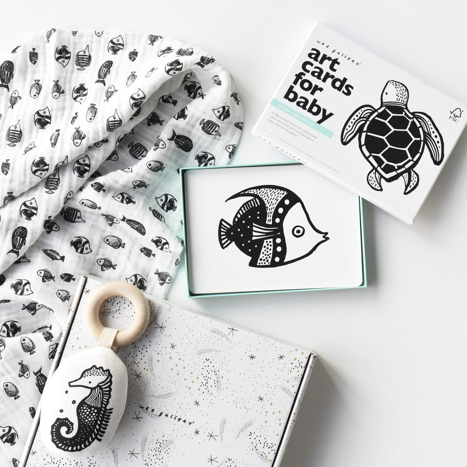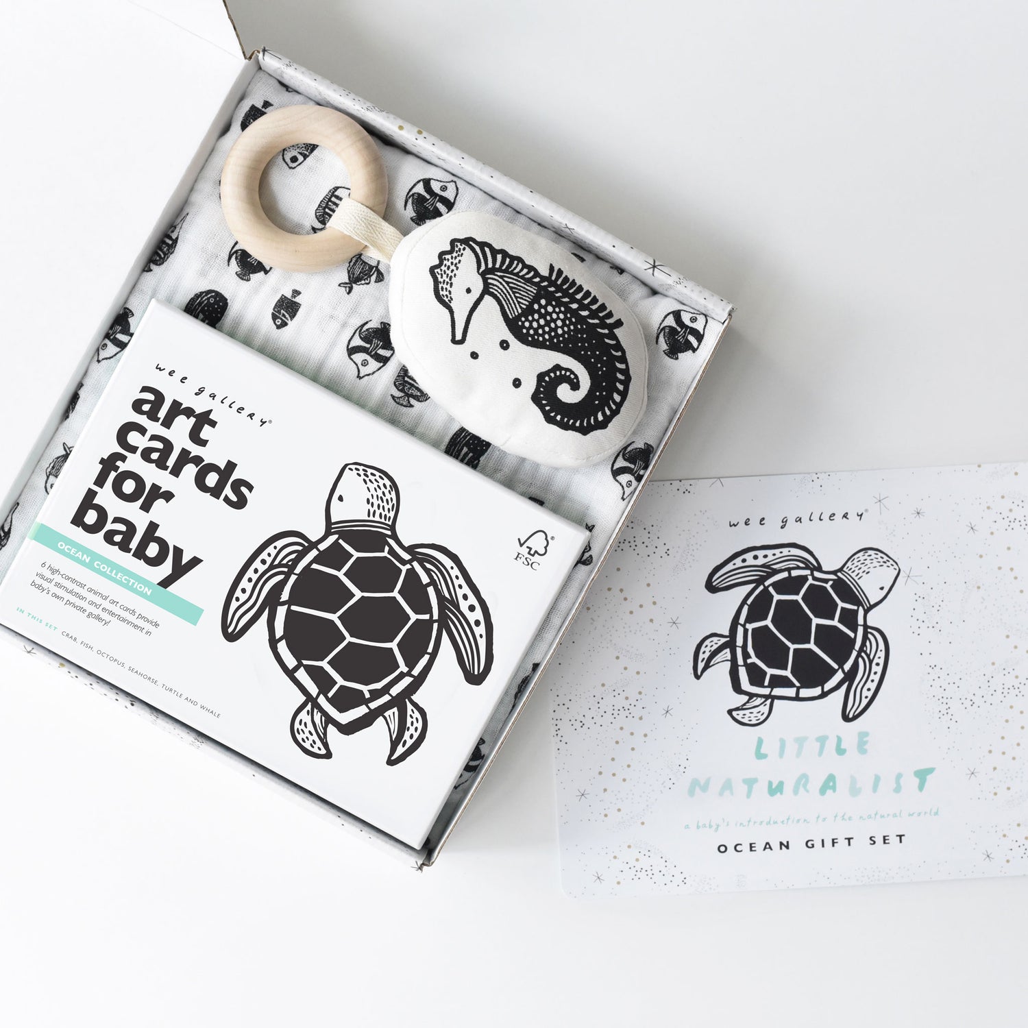 Nuestro set de regalo “Little Naturalist” contiene nuestros juguetes más populares para tu bebe! El regalo perfecto para un recién nacido o un bebé! Hemos pareado un mordedor orgánico de caballito de mar, con nuestras best seller art cards de océano y una colchita de algodón orgánico de pecesito.