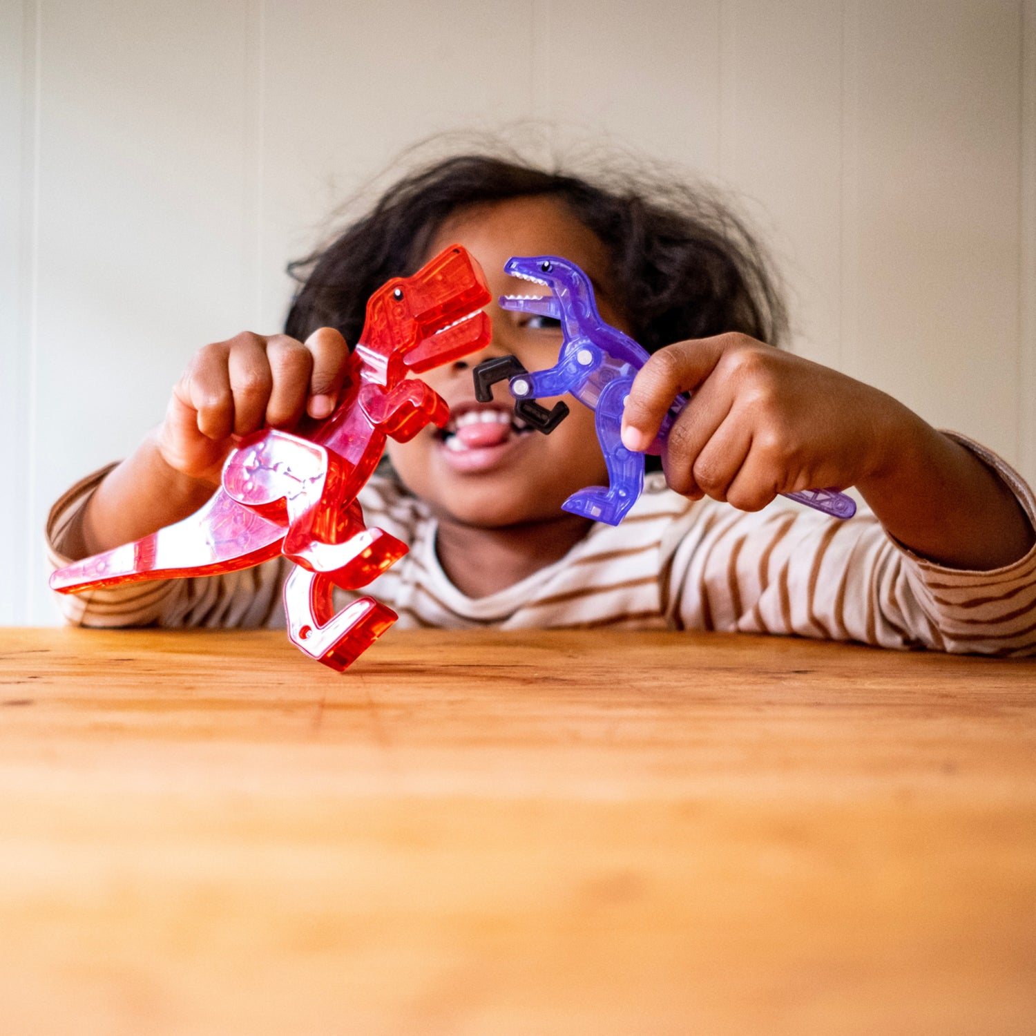Volcanic explosions, molten lava, and ferocious dinosaurs are bursting onto the scene! The Dino World 40-Piece set features four oversized, fully-magnetic dinosaurs and brightly-colored, volcanic-themed tiles for imaginative play potential that never goes extinct.