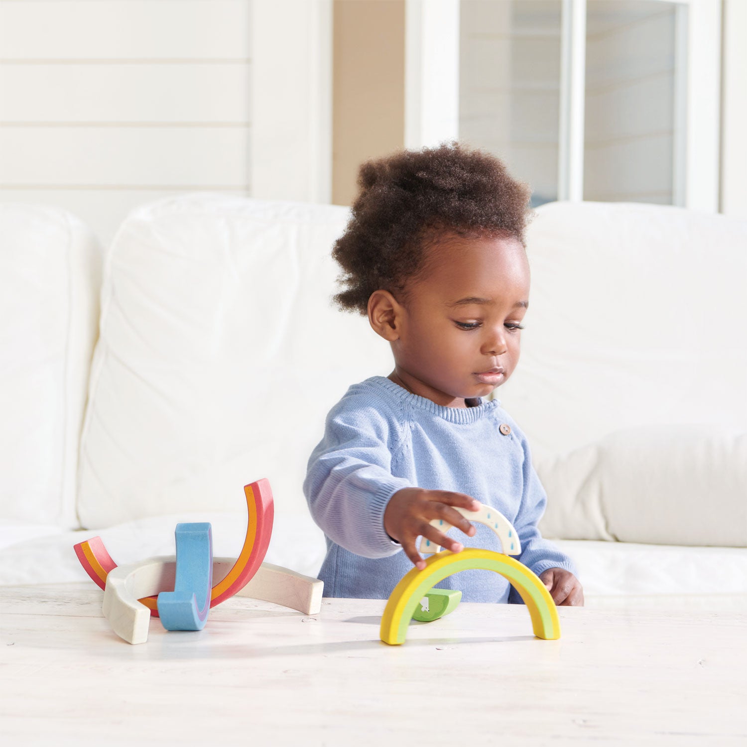 Stack these tunnel pieces together to make a real rainbow! A great first puzzle for your toddler to develop their matching skills, size and color recognition.