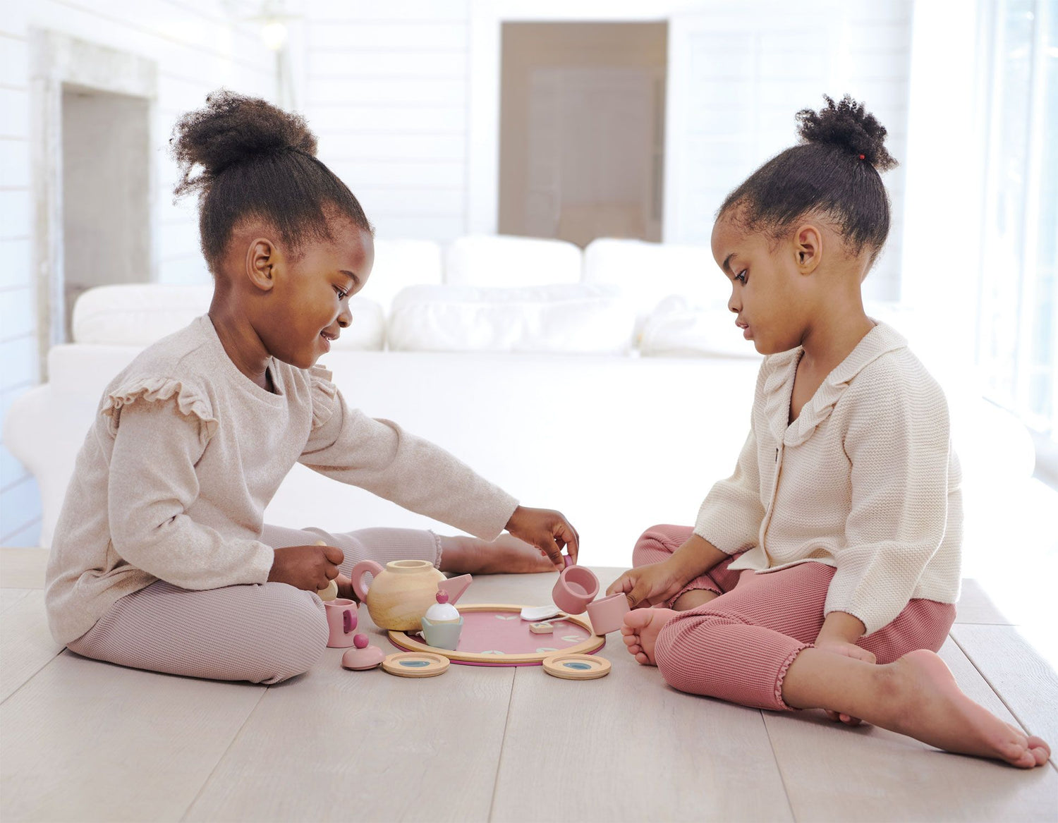 A romantic wooden tea set featuring a pretty bird motif on the saucers and the side of a solid wood teapot.