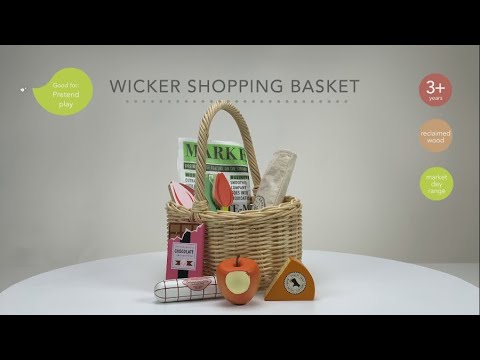 Go shopping just like mum and dad! A gorgeous handcrafted wicker basket containing a bar of chocolate, a bottle of lemonade, a continental salami, some cheese, a baguette in a cloth bag, three tulips and a leaf. An apple with a bite taken out of it, and a newspaper.